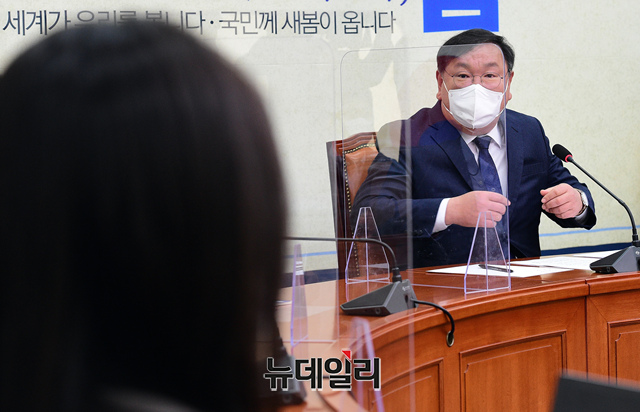 김태년 더불어민주당 대표 직무대행이 11일 오전 국회에서 열린 기자간담회에서 기자들의 질문에 답하고 있다. (사진=공동취재단)