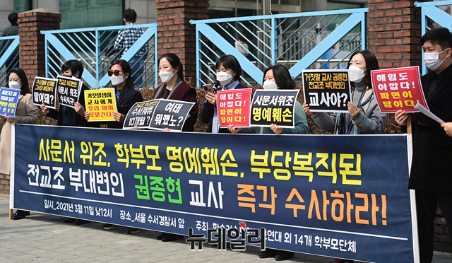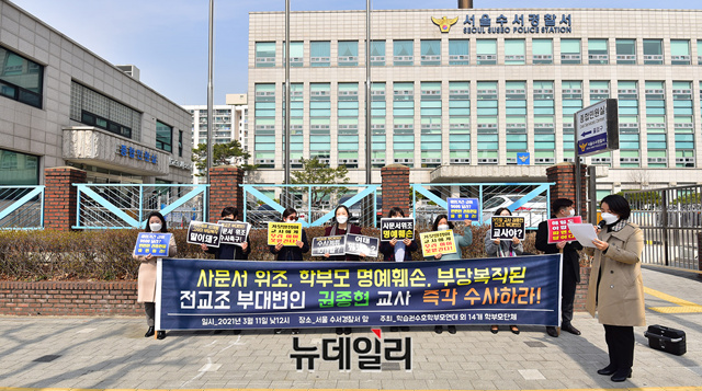 학습권수호학부모연합을 비롯한 시민단체가 11일 정오 서울 강남구 수서경찰서 앞에서 부적절한 행위로 해임돼 복직한 전교조 교사의 수사를 촉구하는 기자회견을 갖고 있다.