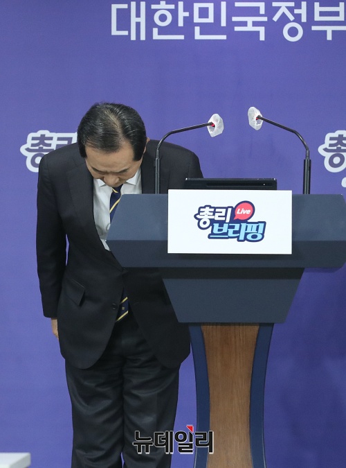 정세균 국무총리가 11일 오후 서울 종로구 정부서울청사에서 LH 신도시 투기 1차 전수조사 브리핑 전 고개숙여 인사하고 있다.