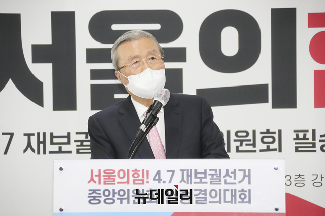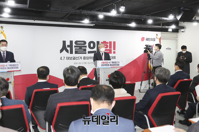 김종인 국민의힘 비상대책위원장이 11일 오후 서울 여의도 국민의힘 중앙당사에서 열린 '국민의힘 4.7 보궐선거 중앙위원회 필승결의대회'에서 발언을 하고 있다. (사진=국민의힘)
