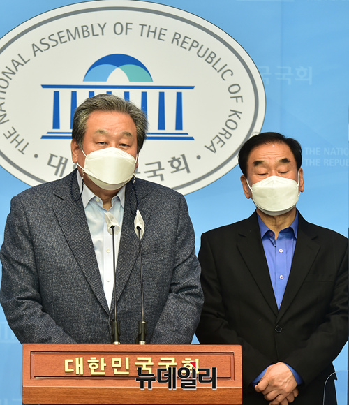 김무성 전 새누리당 대표와 이재오 전 의원이 14일 오후 국회 소통관에서 기자회견을 갖고 오세훈 국민의힘 후보와 안철수 국민의당 후보의 서울시장 보궐선거 야권 후보 단일화를 촉구 하고 있다.