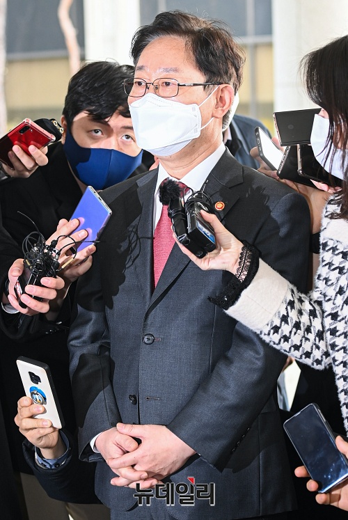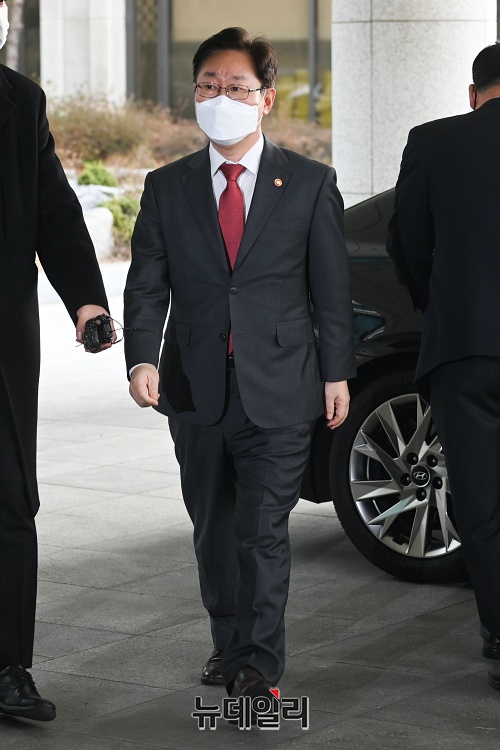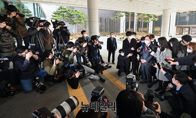 박범계 법무부 장관이 15일 오전 서울 서초구 서울고등검찰에서 열린 LH관련 전국고검장 간담회에 참석해 취재진의 질문에 답하고 있다.