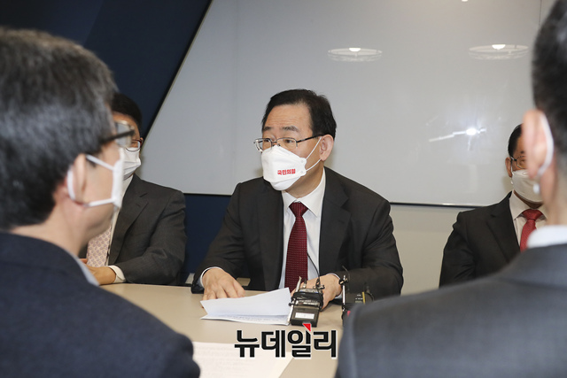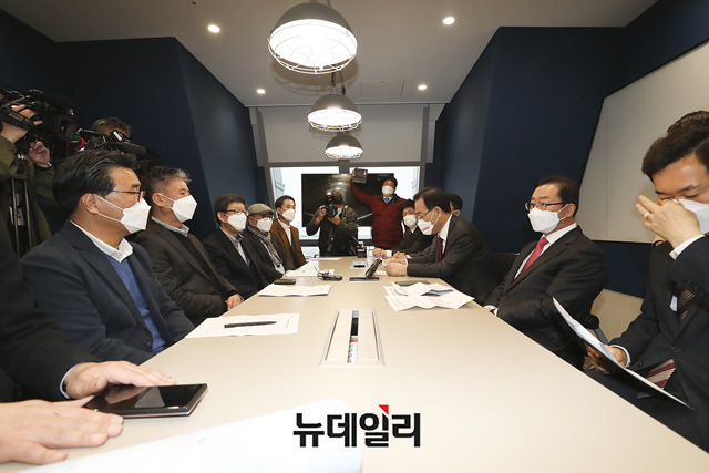 주호영 국민의힘 원내대표가 15일 서울 중구 한 여행업 공유사무실을 방문해 코로나19 이후 어려워진 업계 현황을 살펴보고 간담회를 갖고 있다. (사진=국민의힘)