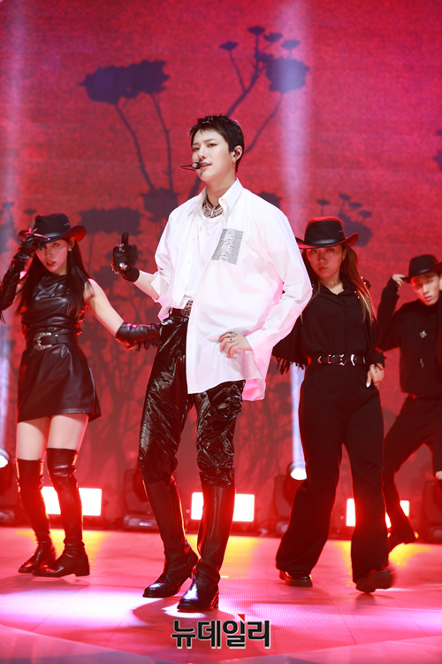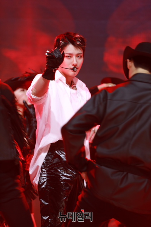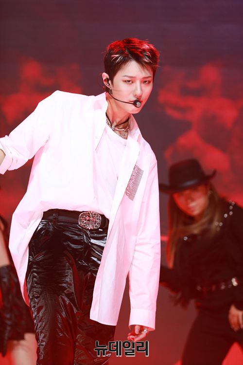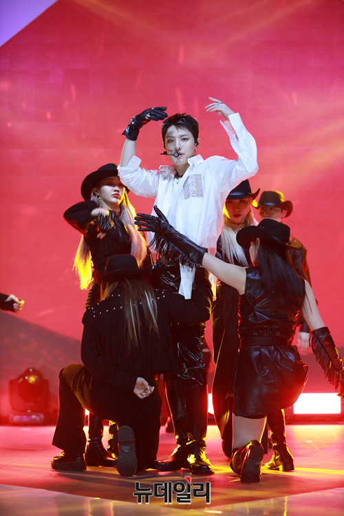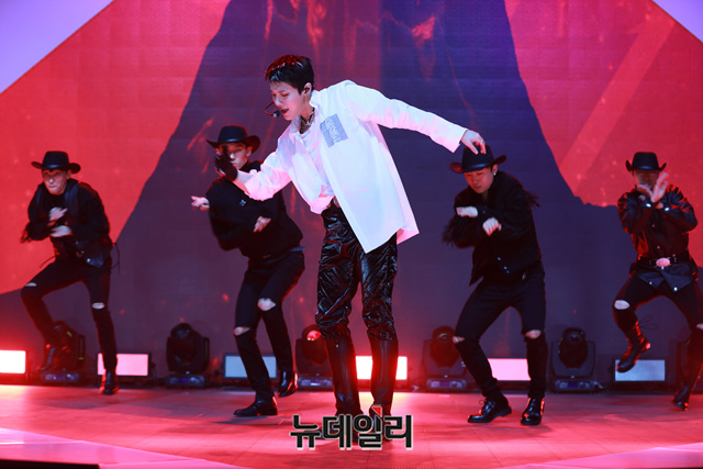 가수 '우즈(WOODZ, 조승연)'가 15일 오후 온라인으로 열린 2번째 미니앨범 'SET(셋)' 쇼케이스에서 타이틀곡 무대를 선보이고 있다.