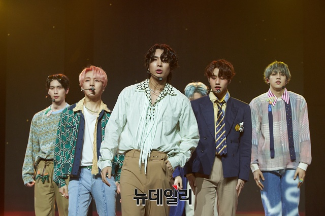 아이돌그룹 펜타곤 이 15일 오후 온라인으로 진행된 미니앨범 'LOVE or TAKE(러브 올 테이크)' 쇼케이스에서 무대를 선보이고 있다.