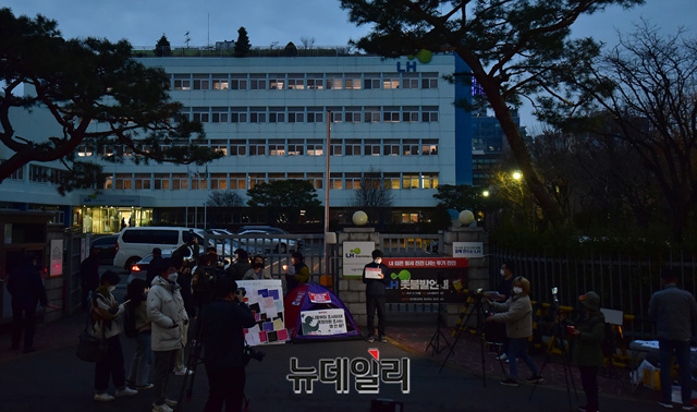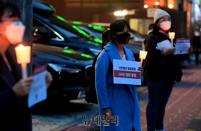 한국청년연대를 비롯한 청년단체가 15일 서울 강남구 LH서울지역본부 앞에서 LH투기를 규탄하는 촛불집회를 갖고 있다.