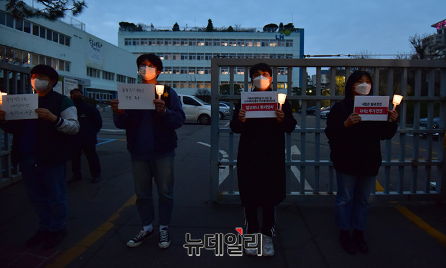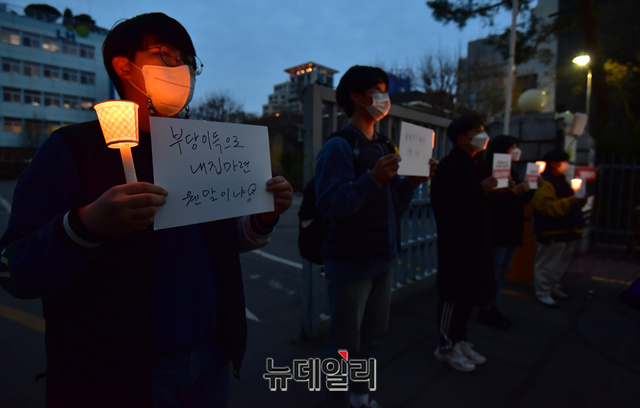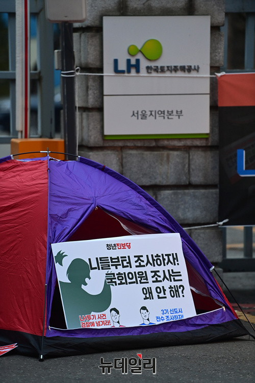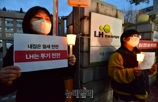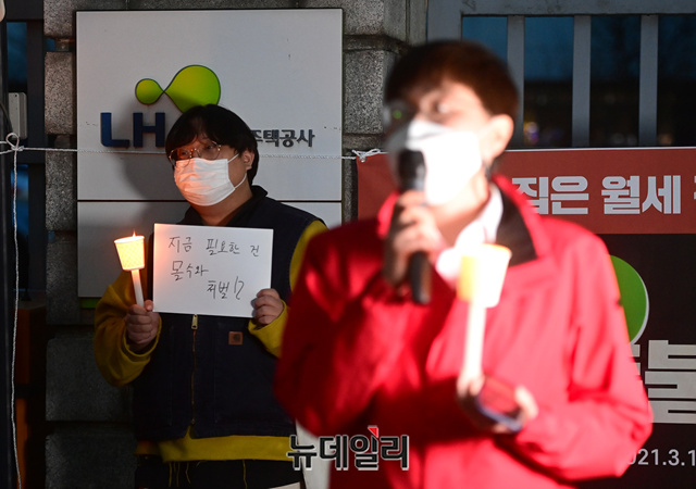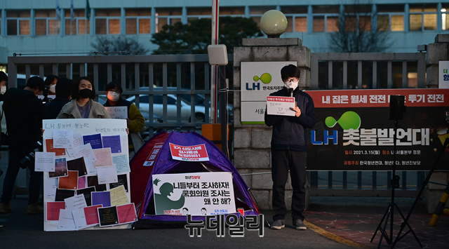 한국청년연대를 비롯한 청년단체가 15일 서울 강남구 LH서울지역본부 앞에서 LH투기를 규탄하는 촛불집회를 갖고 있다.이들은 "투기재산 몰수하고, 투기이익을 전액 환수하라"며 "청와대, 국회, 기초단체 등 모든 공직자를 전수 조사하라"고 주장했다. 또 "투기 전전하는 LH공사를 해체"할 것을 촉구했다. 이날 촛불집회는 청년들의 자유발언을 위주로 진행됐다.