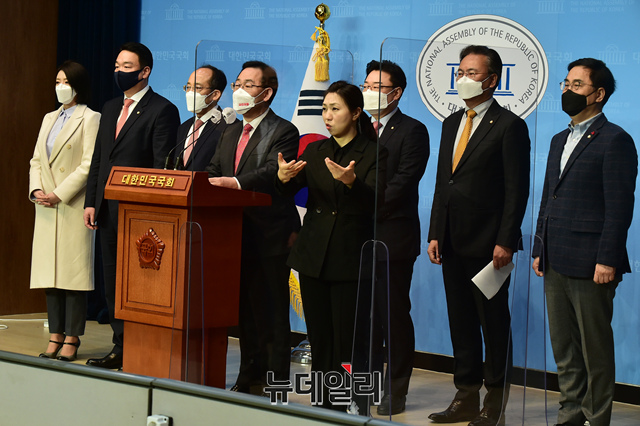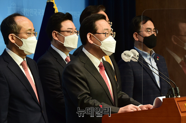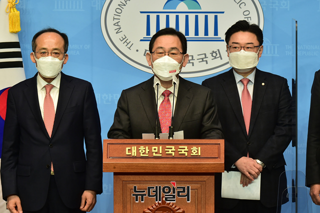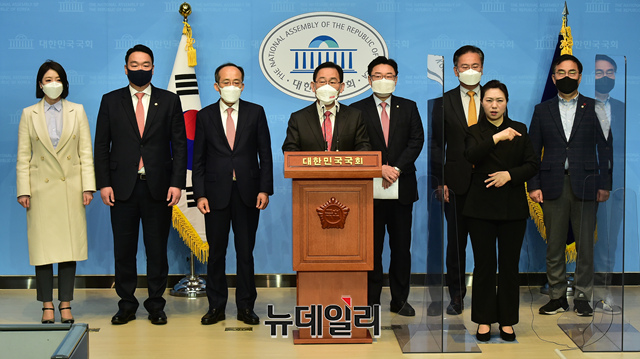 주호영 국민의힘 원내대표가 16일 오전 국회 소통관에서 "더불어민주당에 특검과 국정조사 실시를 요구한다"며 "3월 임시국회 회기 중에 LH 특검법안이 본회의에서 즉시 처리될 수 있도록 특검법안을 공동 발의하겠다"고 발언하고 있다.