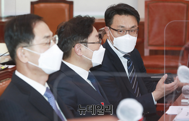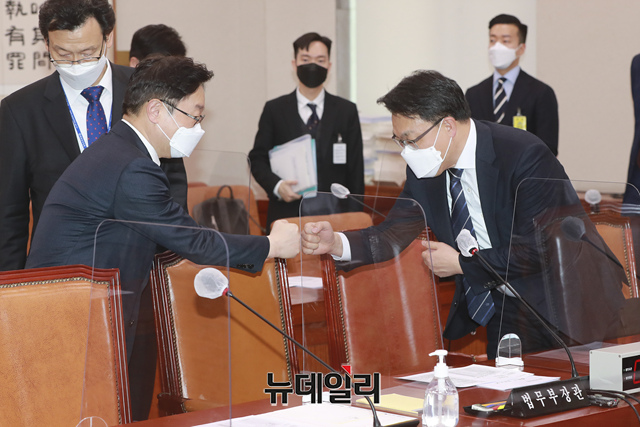 박범계 법무부 장관과 김진욱 고위공직자범죄수사처장이 16일 오후 국회에서 열린 법제사법위원회 전체회의에 출석해 대화를 나누고 있다. (사진=공동취재단)