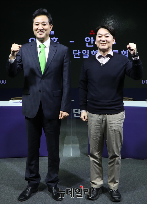 오세훈 국민의힘 서울시장 후보와 안철수 국민의당 서울시장 후보가 16일 오후 서울 여의도의 한 스튜디오에서 열린 후보 단일화 TV토론회에 앞서 포토타임을 갖고 있다. (사진=공동취재단)