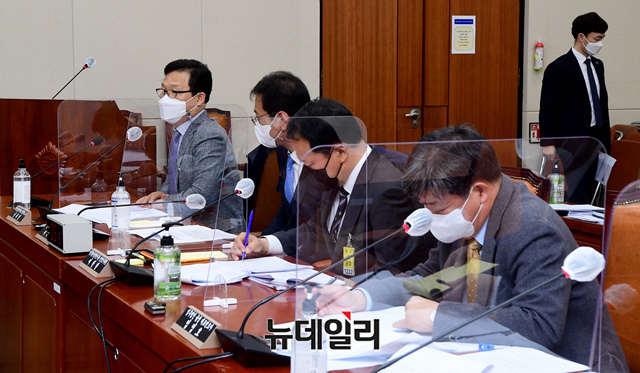 이해충돌방지법에 대한 공청회가 17일 오전 국회에서 열린 정무위원회 전체회의에서 진행되고 있다. (왼쪽부터 윤태범 한국방송통신대 교수, 이재근 참여연대 권력감시국장, 이천현 한국형사정책연구원 선임연구위원, 임영호 법무법인 율정 변호사, 이건리 국민권익위원회 부위원장) (사진=공동취재단)