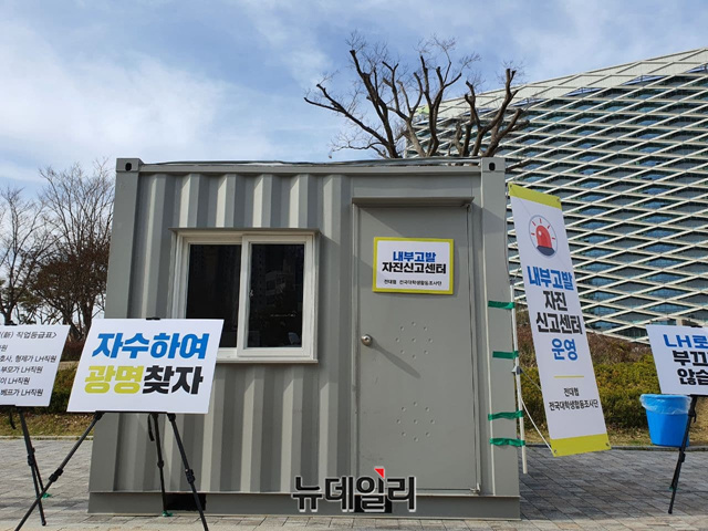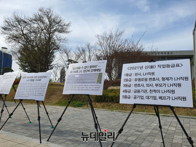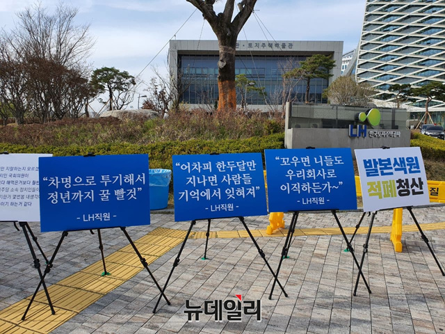 대학생단체인 신전대협이 17일 오후 경남 진주시 한국토지주택공사(LH) 본사 앞에서 전국대학생합동조사단을 구성하고 본사 정문 앞에 '내부고발자진신고센터'를 운영한다고 밝혔다.이들은 이날 자진신고센터 개소식과 함께 최근 인터넷 커뮤니티에서 화제가 된 LH 사태를 풍자한 발언을 담은 피켓 전시회를 열었다.신전대협은 성명에서 "LH 투기 사건은 사내 복지가 아닌 명백한 '반칙'"이라며 "밝혀질 사실을 감추는 데 마지막 남은 양심을 낭비하지 말라. 국민적 용서는 불가하지만, 자수를 통해 지켜낸 양심과 공정이 더 나은 세상의 토대가 될 것"이라고 투기 가담자들의 자수를 호소했다.김태일 신전대협 의장은 "내부고발로 마지막 남은 의인이 되어달라"며 "대학생들의 이름으로 대리고발해 신고자의 안전을 보호하겠다"고 밝혔다. (사진=新전대협)
