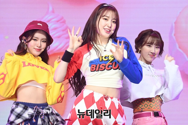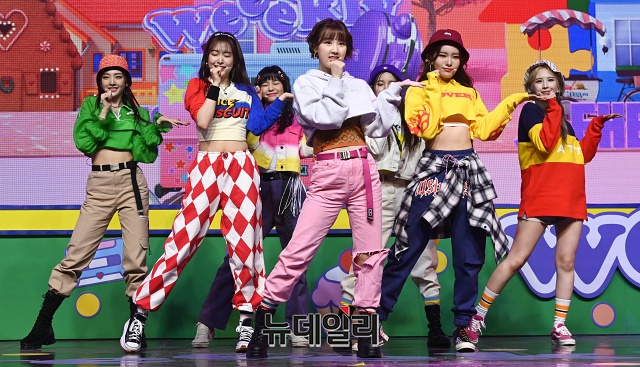 걸그룹 위클리가 17일 오후 서울 마포구 신한카드 판스퀘어에서 열린 미니 3집 'We play(위 플레이)' 쇼케이스에서 무대를 선보이고 있다.