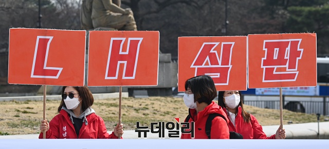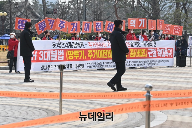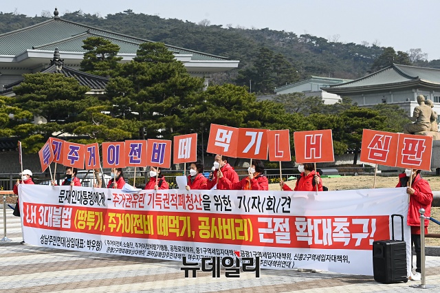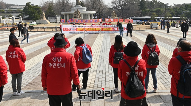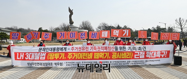 성남주민연대가 18일 오전 서울 종로구 청와대 분수대 앞에서 열린 LH 3대불법근절 확대촉구 기자회견에서 구호를 외치고 있다.이들은 "LH가 진행해 온 도심재개발 공익사업은 주택이 주거권이 아닌 돈 가진 사람들이 돈 놓고 돈먹기 장사를 하는 상품으로 변질된 사업"이라며 "문재인 대통령은 LH 불법이 땅투기 뿐 아니라 세입자 주거이전비 떼먹기, 공사비리 등 전 영역에서 행해졌음을 직시하고 LH 3대불법근절로 영역을 확대해야 할 것"이라고 밝혔다.