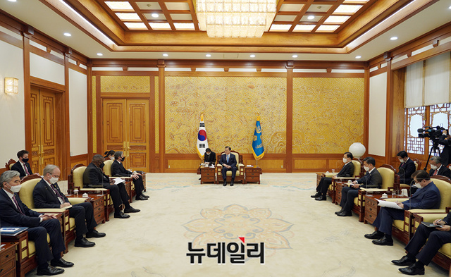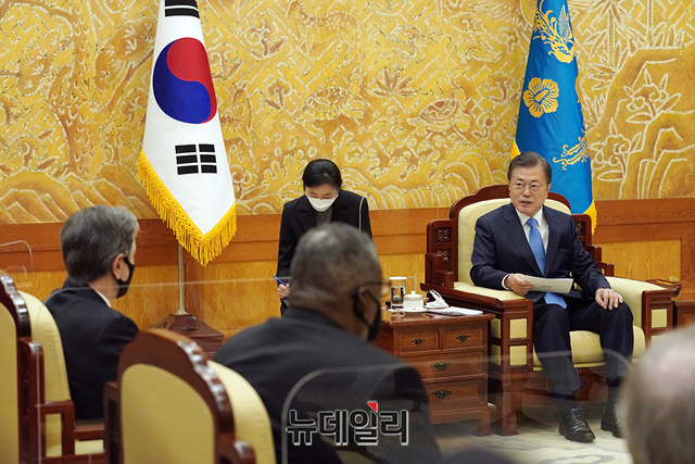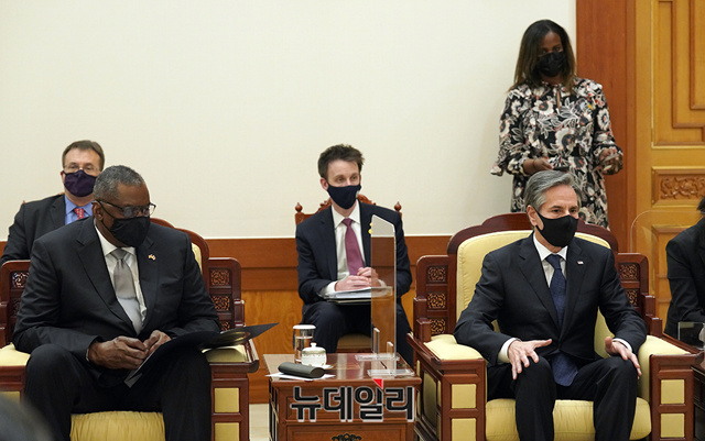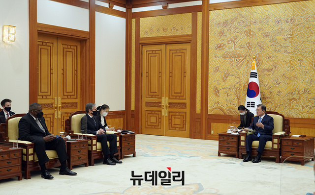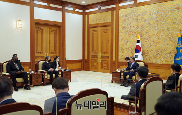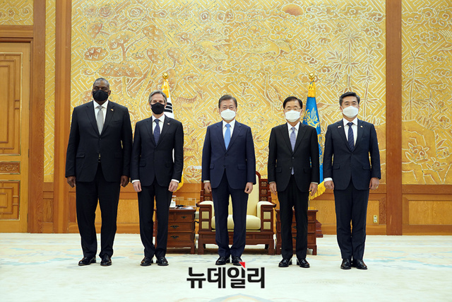문재인 대통령이 18일 오후 청와대에서 토니 블링컨 미국 국무장관과 로이드 오스틴 국방장관 접견에 앞서 기념촬영을 하고 있다. (사진은 왼쪽부터 로이드 오스틴 국방장관, 토니 블링컨 국무장관, 문 대통령, 정의용 외교부 장관, 서욱 국방부 장관, 사진=청와대)