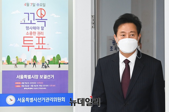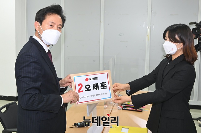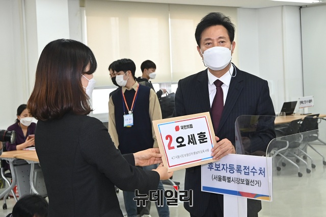 오세훈 국민의힘 서울시장 후보가 19일 오후 서울 종로구 서울시선관위에서 후보 등록을 하고 있다.