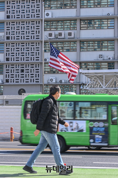 서울 종로구 광화문 주한 미국 대사관에 22일 오전 조기가 게양돼있다.