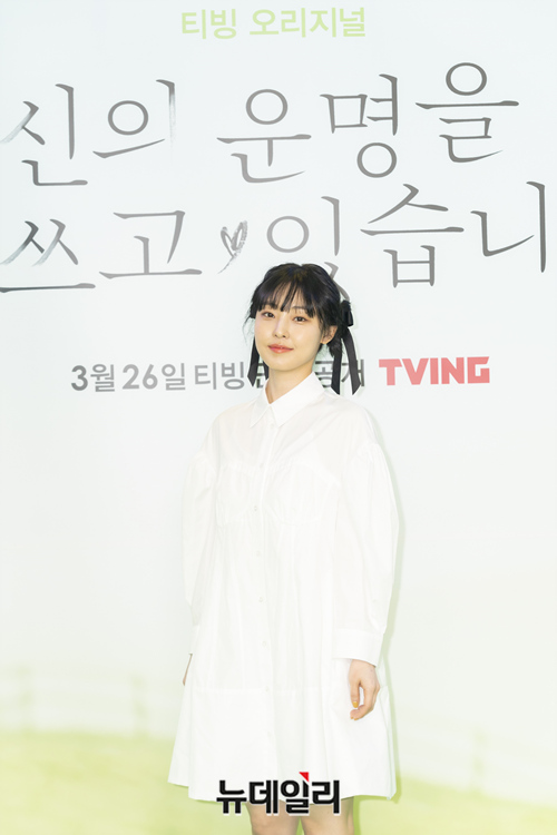 배우 전소니가 22일 오후 온라인으로 열린 티빙 오리지널 '당신의 운명을 쓰고 있습니다(연출 김병수, 극본 은선우)' 제작보고회에서 포토타임을 갖고 있다.'당신의 운명을 쓰고 있습니다'는 인간의 운명을 쓰는 '신' 신호윤(기도훈)이 세기의 로맨스를 완성하기 위해 막장 드라마를 쓰는 '작가' 고체경(전소니)의 작품을 표절해 명부를 작성하면서 벌어지는 이야기를 담은 판타지 로맨스 드라마다.라이징스타 스타 전소니, 기도훈, 박상남, 김우석, 갈소원이 출연한다. 26일 오후 4시 티빙에서 전편 단독 공개된다. (사진=티빙)