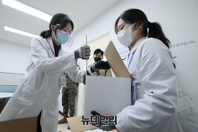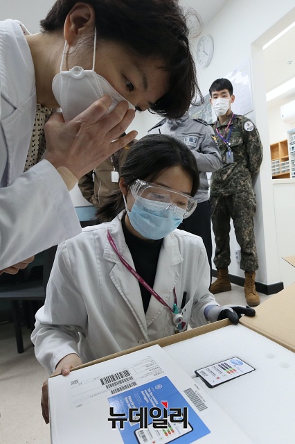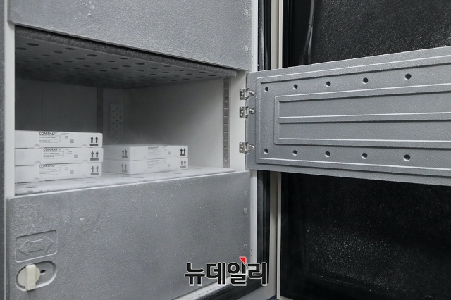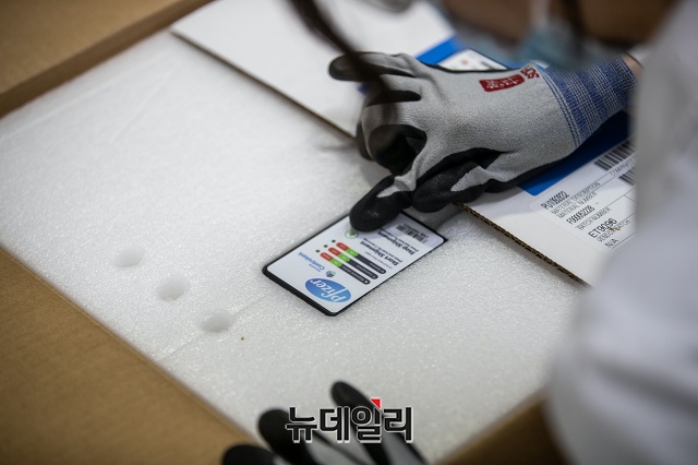 미국 화이자 코로나19 백신 25만명분이 국내에 입고된 24일 오전 서울 중구 국립중앙의료원 중앙예방접종센터에서 의료진이 백신이 담긴 박스의 온도 기록 장치를 끄고 있다.