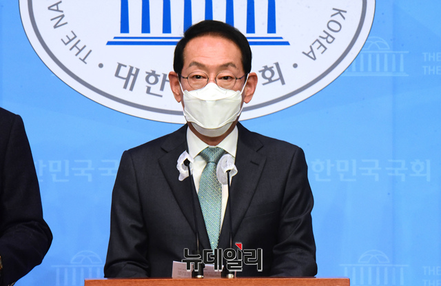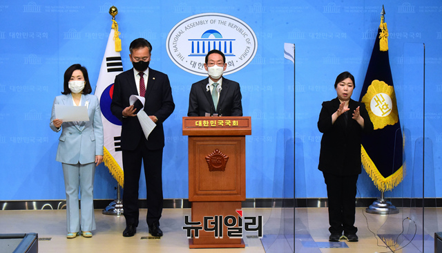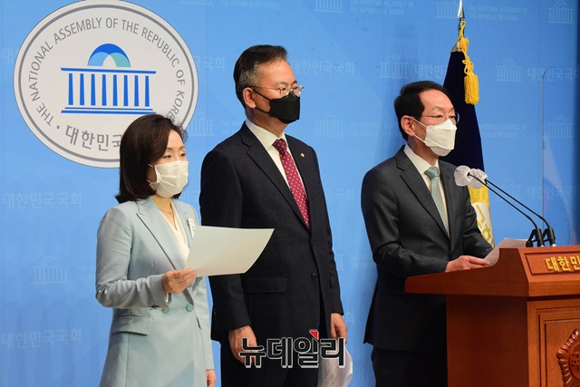 국민의힘 국회 법제사법위원 김도읍, 유상범, 전주혜 의원이 21일 오후 국회 소통관에서 한전공대법 날치기 관련 기자회견을 갖고 있다.