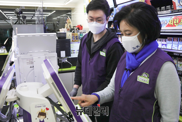 박영선 더불어민주당 서울시장 후보가 공식 선거 운동 첫 날인 25일 오전 서울 마포구 한 편의점에서 아르바이트를 하고 있다. (사진=박영선 캠프)