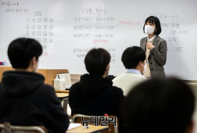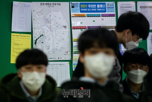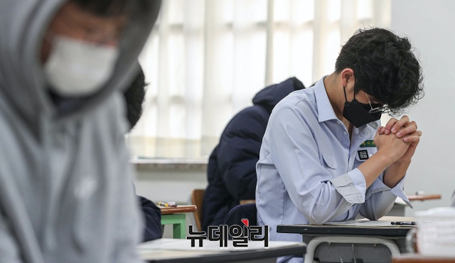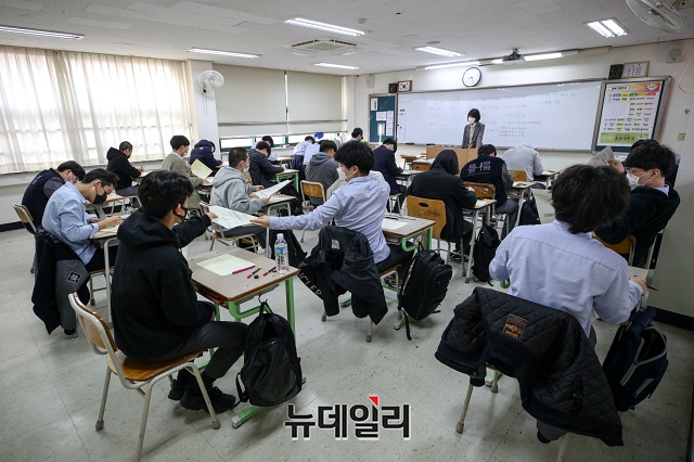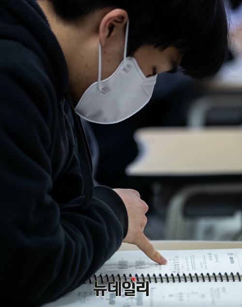3월 전국연합학력평가가 치뤄지는 25일 오전 서울 종로구 경복고등학교에서 수험생이 시험지를 확인하고 있다.2022학년도 대학수학능력시험 개편에 따라 고등학교 3학년은 국어와 수학 영역이 공통과목과 선택과목 체계로 출제되고, 계열 구분 없이 사회·과학 탐구 영역 중 2개 과목을 선택할 수 있다.이번 전국연합학력평가에는 전국 고등학교 1∼3학년 학생 97만여 명이 응시한다. 코로나19 예방을 위해 23일 1학년, 24일 2학년, 25일 3학년으로 분산 시행된다. (사진=공동취재단)
