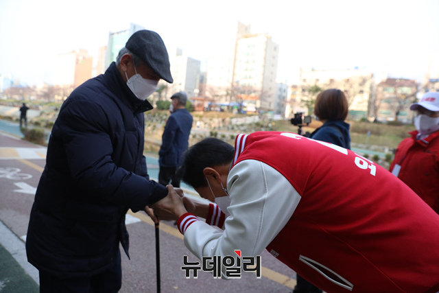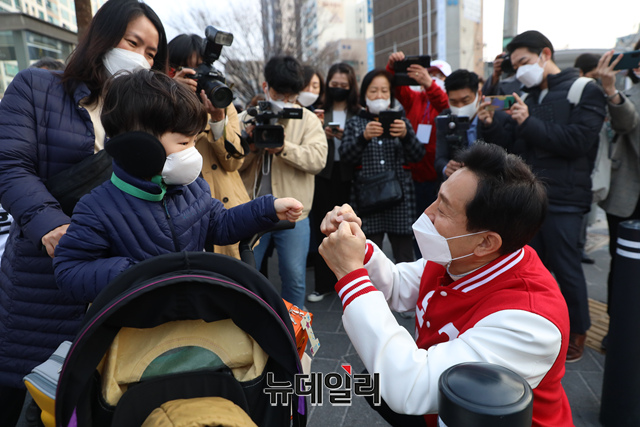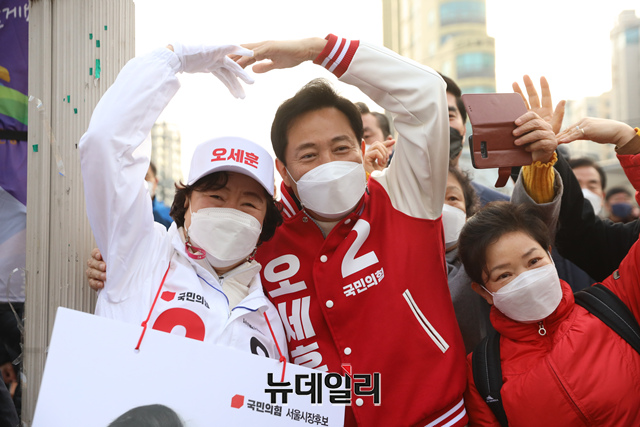 오세훈 국민의힘 서울시장 후보가 25일 오전 서울 응암역 인근에서 지지를 호소하고 있다. (사진=오세훈 캠프)