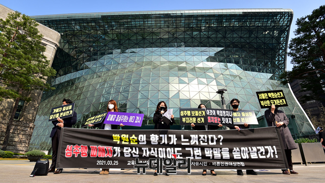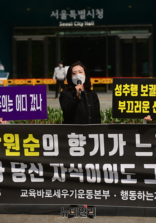 - 다음은 성명서 전문이다.교육바로세우기운동본부 성명서우리는 똑똑히 기억한다. 그리고 절대 잊지 않을 것이다.대한민국을 충격에 빠트린 사건, 대한민국을 수치스럽게 만든 사건.그리고도 반성할 줄 모르는 자들의 끊임없는 궤변과 피해자를 더욱 절망스럽게 만드는 끝도 없는 2차 가해,이것이 모두 자살로 죗값을 회피하려 했던 박원순 전 시장의 무책임함에서 비롯된 참사이다.이들의 잔인함은 피해자를 ‘피해호소인’으로 부르는 것을 시작으로 조용히 가족장으로 치르겠다고 했던 장례식을 ‘서울시장(葬)’으로 업그레이드하고, 당헌당규를 바꿔 서울시장 후보를 공천하는 것으로 이어졌다. 게다가 서울시장 후보 캠프에는 ‘박원순이 살아 돌아왔다’고 해도 놀라지 않을 정도로 그를 그리워하며 닮겠다는 사람들로 줄을 섰고, 어떻게든 서울시장 자리를 차지하겠다고 총동원령까지 내려졌다.이런 행동들이 피해자를 더 고통스럽게 만들고 있다는 것을 자신들이 모를 리 없으니, 그래서 그들의 잔인함이 더 끔찍하다는 것이다.그뿐인가 집권여당의 태도가 이러하니 피해자를 ‘미필적 고의에 의한 살인죄’로 고발하겠다는 자들이 등장할 수밖에 없고, 이들이 또다시 고통을 벗어나 이제 일상으로 돌아가고 싶다는 피해자를 ‘공무원의 정치적 중립의무’를 위반한 사람으로 몰아 고발까지 하게 만드는 것이다. 이정도면 조직적 가해이고 인격 살인이다.그런데 이들의 잔인함은 그 끝을 알 수 없다.이 정권의 대통령 비서실장이었다는 사람은 뜬금없이 박원순의 향기가 느껴진다고 한다. 그도 모자라 ‘용산 공원의 숲속 어느 의자엔가 박원순의 이름 석 자를 새겨 넣었으면 좋겠다.’ 한다.아니 어느 누가 박원순 이름 석 자가 새겨진 숲속 그 어느 의자에 앉고 싶어 한다고 의자타령인가. 설사 모르고 앉았다 하더라도 그 이름 석 자를 발견하는 순간 얼마나 소스라치게 놀라겠는가. 공원 숲속에서...서울 곳곳에서 박원순을 보고, 박원순의 목소리를 듣는다는 임종석 전 비서실장은 본인이 마치 감성적인 문학 소년이라도 된 줄 아는 모양인데, 본인이 지금 얼마나 끔찍한 가해를 하고 있는지 알기나 하는가.피해자가 당신 딸이어도 그렇게 한가하게 향기에 취해 있을 수 있겠는가.지난 4년간 우리는 적폐청산 소리를 지겹게 들어왔다. 그러나 그들 자신도 청산의 대상인 적폐였다. 경기는 바닥으로 치닫고, 부동산 빈익빈부익부는 더욱 심해졌다. 국민갈라치기로 국민들 간의 이념적 대립은 또 어떤가. 대한민국 곳곳에서 도저히 상식적으로 이해 할 수 없는 일들이 반복적으로 일어났고, 급기야 서울 부산 두 거대 도시의 시장이 모두 성추행을 저질렀다. 이런 황당한 일 뒤에는 무책임한 집권여당이 있다. 정당의 역할을 포기한 집권여당, 그 끝은 국민의 심판뿐이다.피해자를 ‘피해호소인’으로 둔갑시킨 남인순의원은 이제 더 이상 ‘여성운동의 대모’가 아닌 위선자가 되었다. 또한 서울시장 후보 캠프에 주요 직책을 맡았던 고민정의원, 진선미의원도 스스로 사퇴했다고 하지만 국민의 따가운 눈총에 못 이겨 결국 쫓겨난 것이나 마찬가지이다. 그러나 이 정도는 그들의 악행에 대한 죗값이라고 보기엔 부족하다. 고민정의원의 대변인 사퇴를 두고 20만 표가 날아갔다고 아쉬워하는 후보가 버젓이 서울시장을 하겠다고 하는 이상, 또한 누가 필요한지 모르겠지만 이제 와서 피해자를 ‘만나는 것이 필요하다면 만나겠다.’는 사람이 서울시장을 하겠다고 하는 이상 그들의 반성은 거짓된 메아리일 뿐이고, 불리한 상황만 잠시 피해보자는 눈가림으로 보일뿐이다. 이제 국민의 준엄한 심판만이 답이다.2021. 03. 25.교육바로세우기운동본부 행동하는자유시민 바른인권여성연합