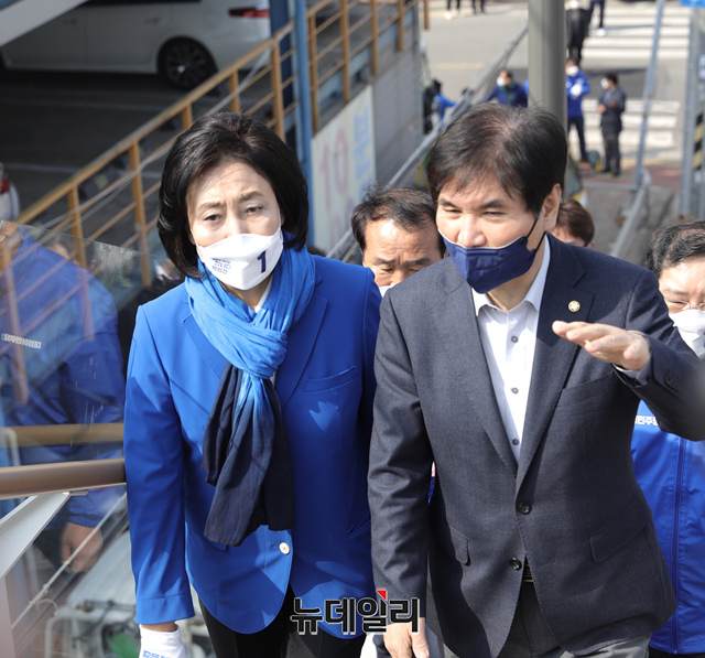 박영선 더불어민주당 서울시장 후보가 25일 오전 서울 양천구 신월동에서 경인지하차도 공사 현장을 방문해 진행상황을 살피고 있다. (사진=박영선 캠프)