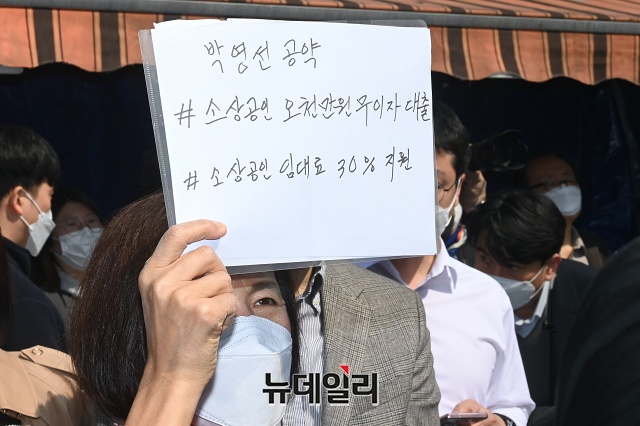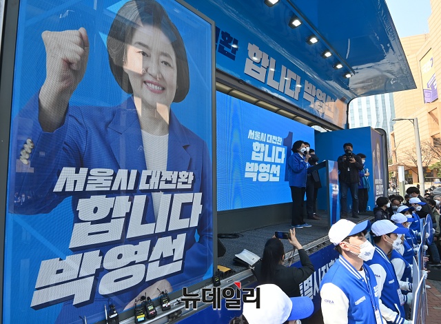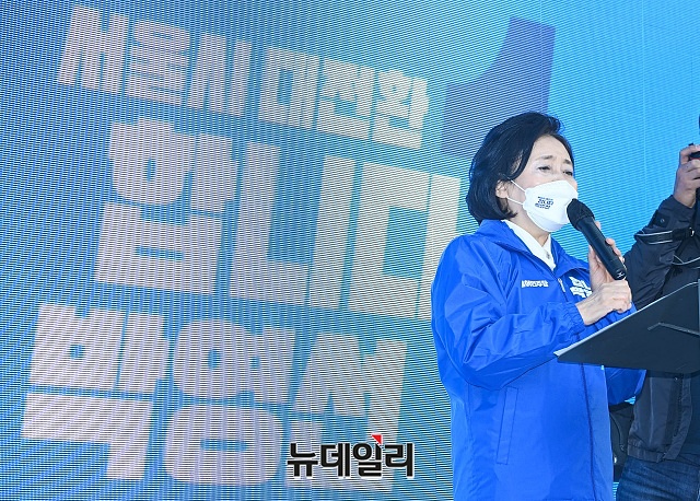 박영선 더불어민주당 서울시장 후보가 25일 오전 서울 구로구 구로디지털단지 지플러스 타워 앞에서 열린 유세 출정식에서 지지호소를 하고 있다.