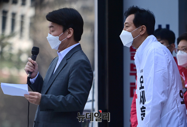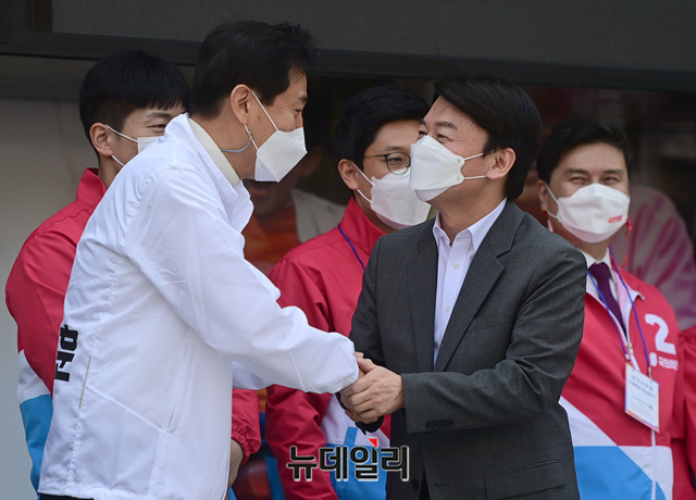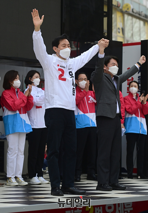 오세훈 국민의힘 서울시장 후보와 안철수 공동선대위원장이 25일 오후 서울 중구 대한문 앞에서 열린 거점유세에서 손을 맞잡고 화답하고 있다.