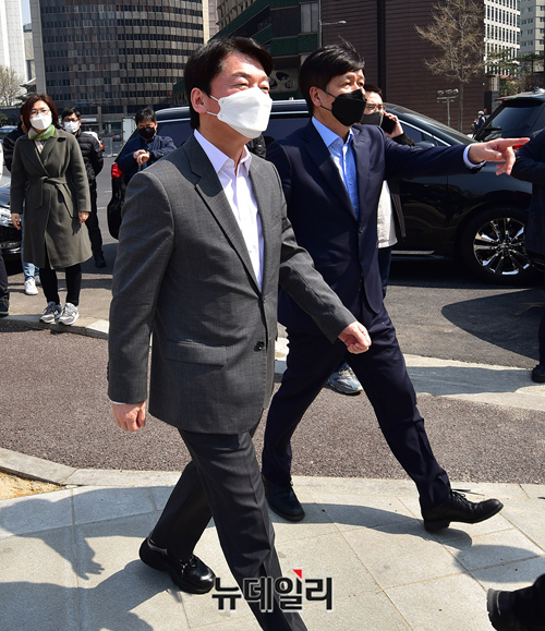 안철수 공동선대위원장이 25일 오후 서울 중구 대한문 앞에서 열린 거점유세장에 도착해 이동하고 있다.
