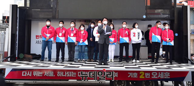 [포토] 오세훈 유세장에 도착한 안철수 공동선대위원장