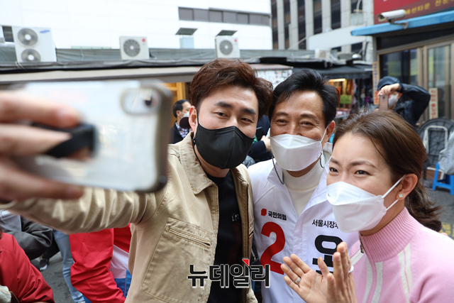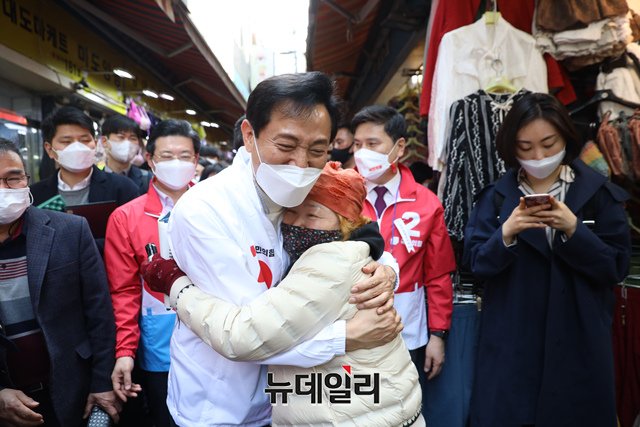 오세훈 국민의힘 서울시장 후보가 25일 오후 서울 중구 남대문 시장을 찾아 시민들에게 지지를 호소하고 있다. (사진=오세훈 캠프)