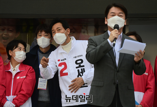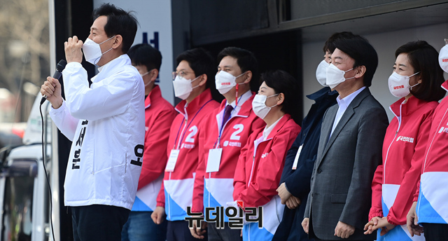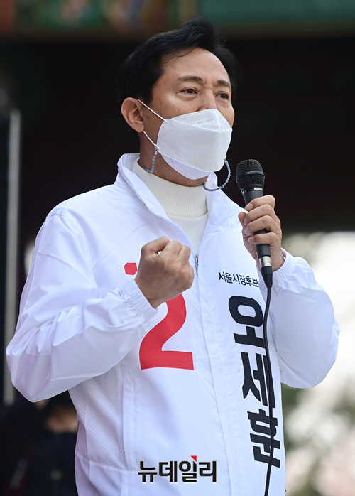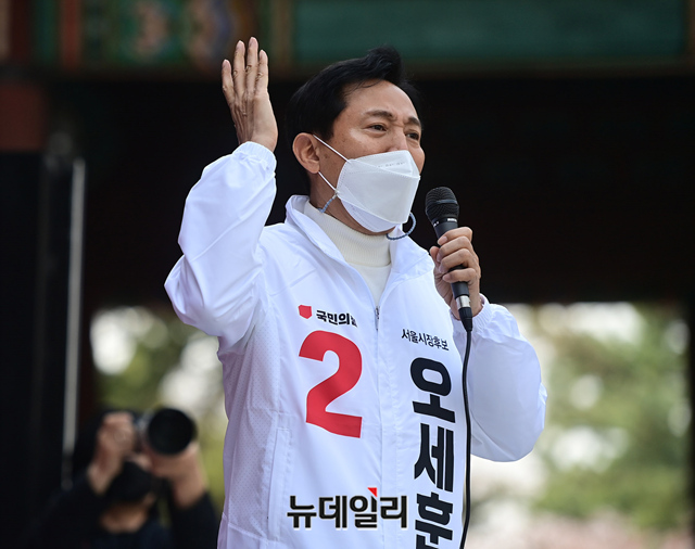오세훈 국민의힘 서울시장 후보가 25일 오후 서울 중구 대한문 앞에서 열린 거점유세에서 지지호소를 하고 있다.