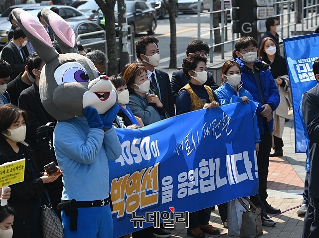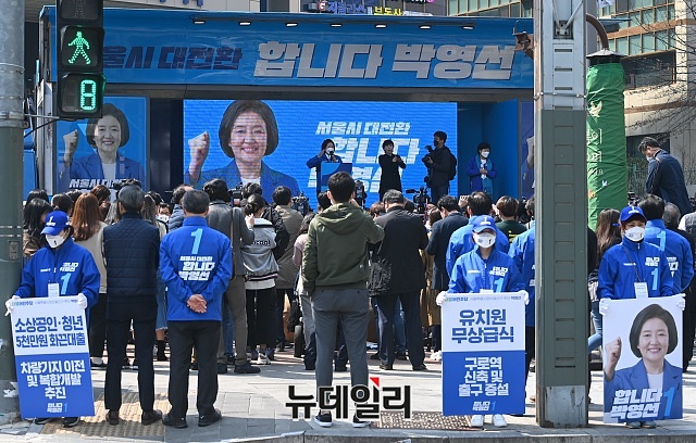 박영선 더불어민주당 서울시장 후보 지지자들이 25일 오전 서울 구로구 구로디지털단지 지플러스 타워 앞에서 열린 유세 출정식에서 박영선 후보의 발언을 듣고 있다.