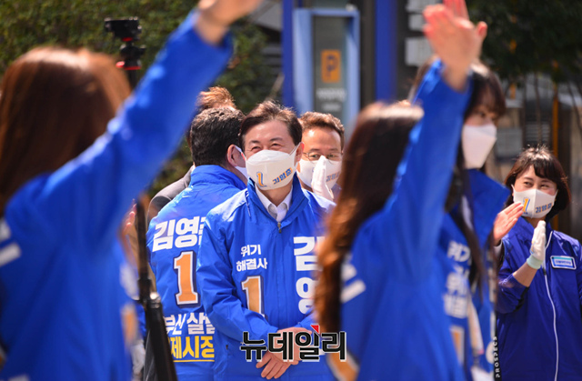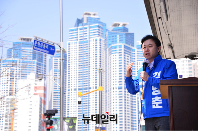 김영춘 더불어민주당 부산시장 후보가 25일 부산 남구 국제금융센터 광장에서 열린 선대위 출정식 'YC-노믹스 선포식'에서 지지를 호소하고 있다. (사진=더불어민주당)