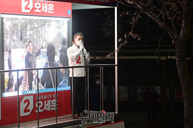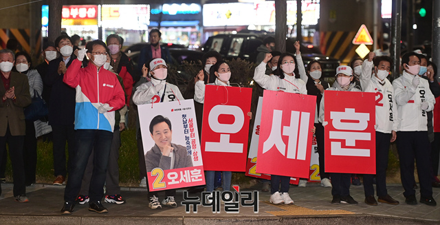 한상학 국민의힘 성북갑 당협위원장(오른쪽)과 정태근 성북을 당협위원장이 본격적인 선거운동이 시작된 25일 오후 서울 성북구 길음역에서 열린 4.7재보궐선거 출정식에서 손을 맞잡고 있다.서울시장 후보는 △더불어민주당 박영선 △국민의힘 오세훈 △기본소득당 신지혜 △국가혁명당 허경영 △미래당 오태양 △민생당 이수봉 △신자유민주연합 배영규 △여성의당 김진아 △진보당 송명숙 △무소속 정동희 △무소속 이도엽 △무소속 신지예 등 12명이다. 공식 선거운동기간은 3월 25일부터 4월 6일까지다.