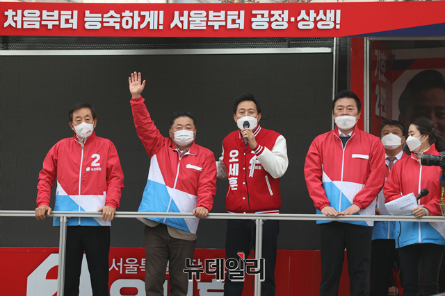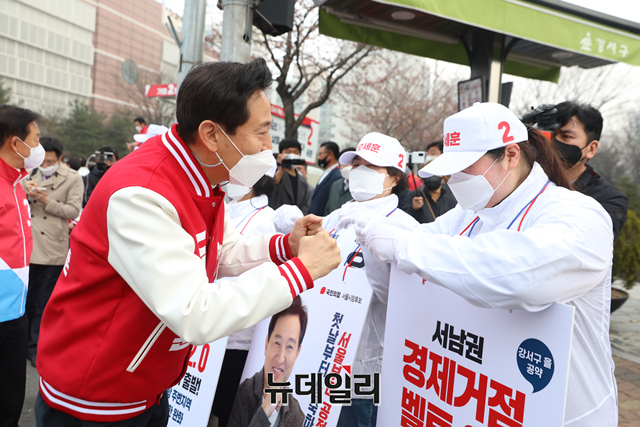 오세훈 국민의힘 서울시장 후보가 26일 오전 서울 강서구 증미역에서 출근길 시민들에게 지지를 호소하고 있다.(사진=오세훈캠프)