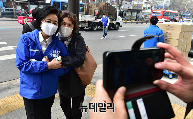 박영선 더불어민주당 서울시장 후보가 26일 오전 서울 서대문구 신촌 현대백화점 앞에서 열린 집중유세에 앞서 시민들과 함께 사진을 찍고 있다.