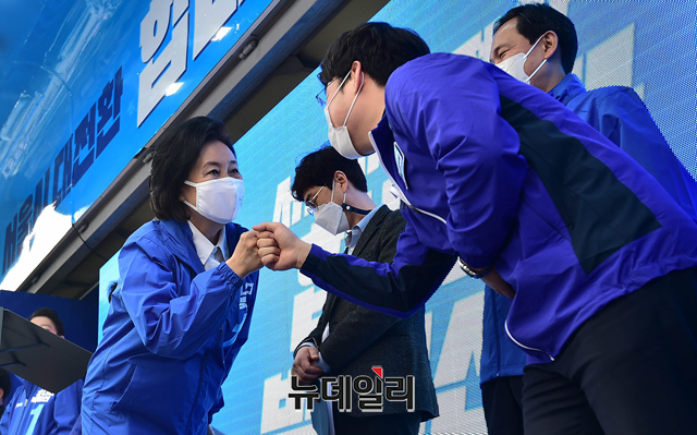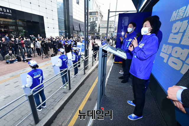 박영선 더불어민주당 서울시장 후보가 26일 오전 서울 서대문구 신촌 현대백화점 앞에서 열린 집중유세에서 지지를 호소하고 있다.