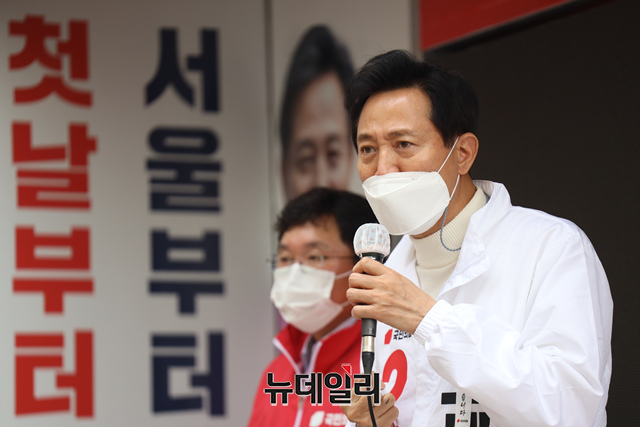 오세훈 국민의힘 서울시장 후보가 26일 오후 서울 구로구 구로주공2차아파트 앞에서 열린 선거유세에서 지지를 호소하고 있다. (사진=오세훈캠프)