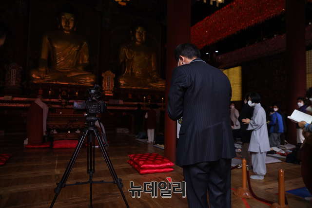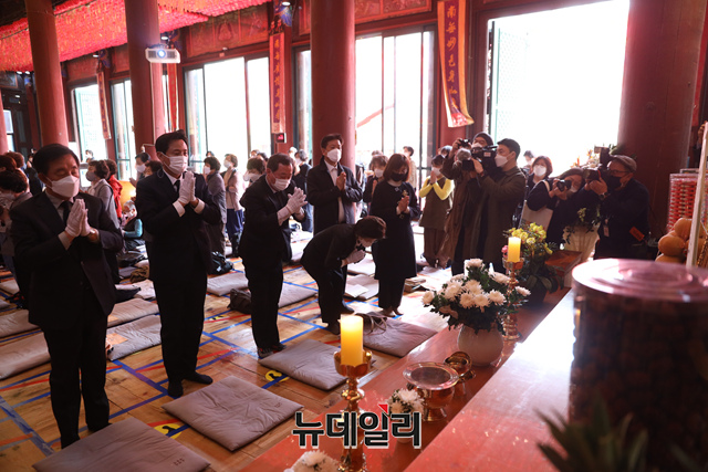 [포토] 조계사 대웅전 찾은 오세훈 후보