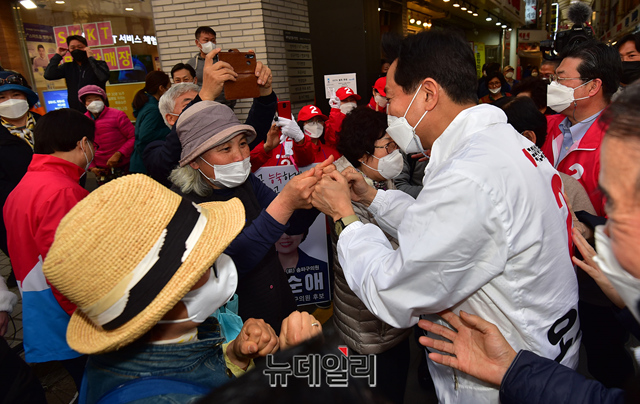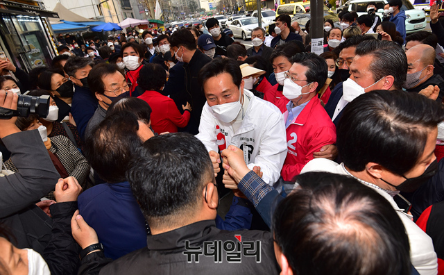 [포토] 송파구 새마을시장서 지지자에 둘러싸인 오세훈