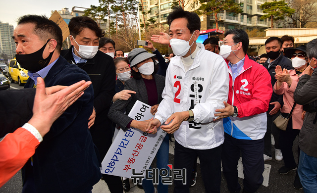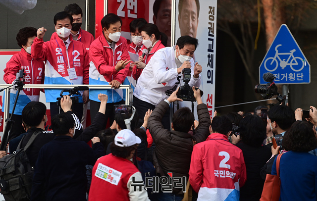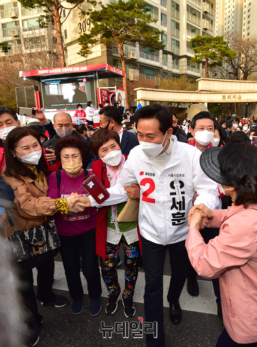 오세훈 국민의힘 서울시장 후보가 26일 오후 서울 송파구 새마을시장 입구를 찾아 유세를 마치고 지지자들에게 손을 흔들어 화답하고 있다.