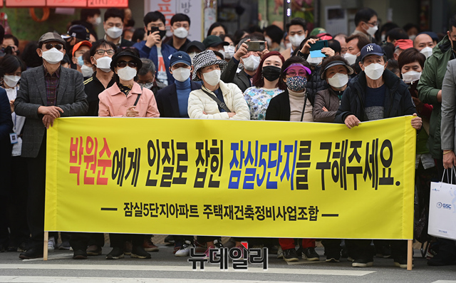 잠실5단지 주민들이 26일 오후 서울 송파구 새마을시장 입구에서 열린 오세훈 국민의힘 서울시장 후보 유세장에서 '잠실5단지에서 박원순을 지워주세요'라고 적힌 현수막을 들고 있다.