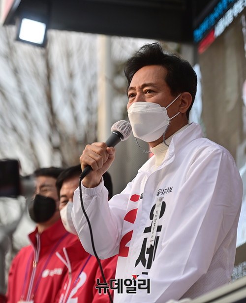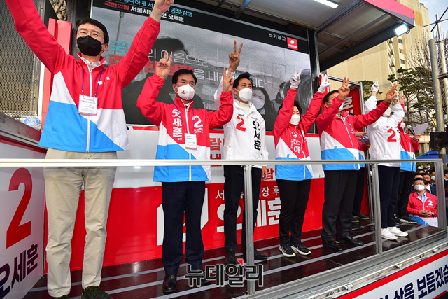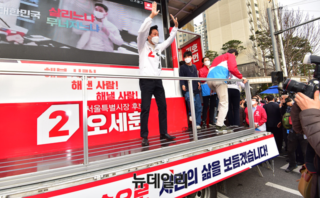 오세훈 국민의힘 서울시장 후보가 26일 오후 서울 송파구 새마을시장 입구에서 열린 선거유세에서 차량에 올라 지지를 호소하고 있다. 이날 유세장에는 김웅(송파갑), 배현진(송파을) 국회의원과 김성태 전 원내대표가 지원에 나섰다.