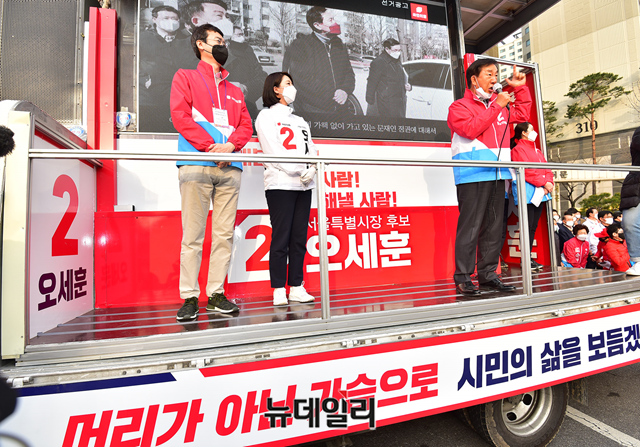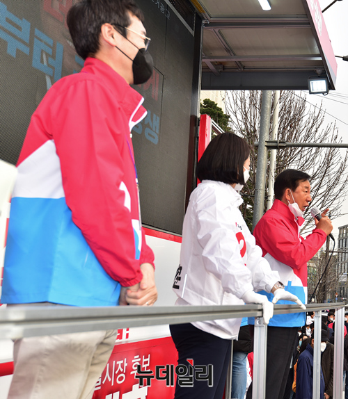 김성태 전 국민의힘 원내대표가 26일 오후 서울 송파구 새마을시장 입구에서 오세훈 서울시장 후보의 지지를 호소하고 있다.