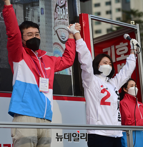 송파구를 지역구로 두고 있는 김웅, 배현진 국민의힘 의원이 26일 오후 서울 송파구 새마을시장 입구에서 열린 오세훈 서울시장 후보의 유세에서 지지호소를 하고 있다.
