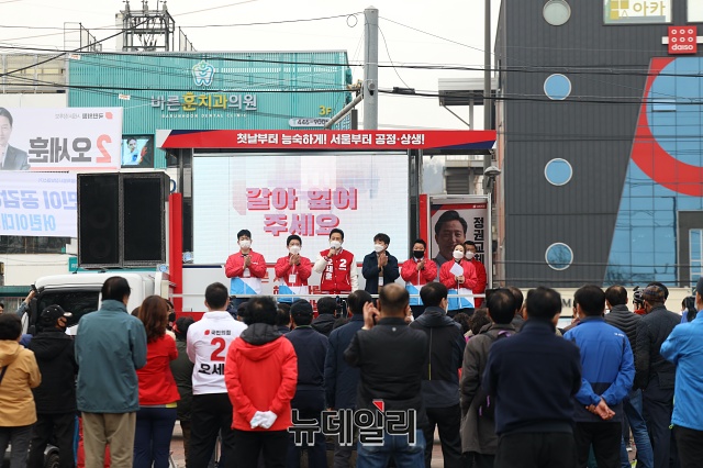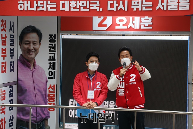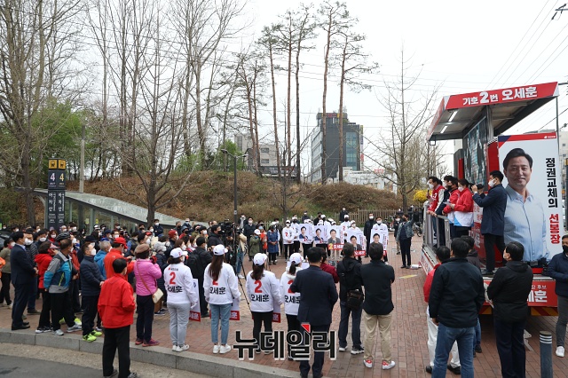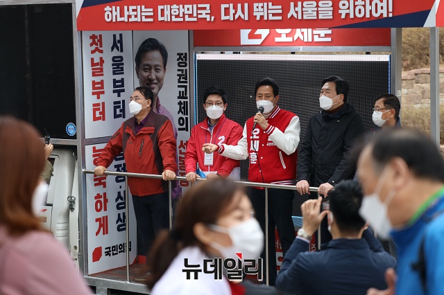오세훈 국민의힘 서울시장 후보가 27일 오전 서울 광진구 어린이대공원 인근에서 지지자들과 기념사진을 찍고 있다. (사진=오세훈 캠프)